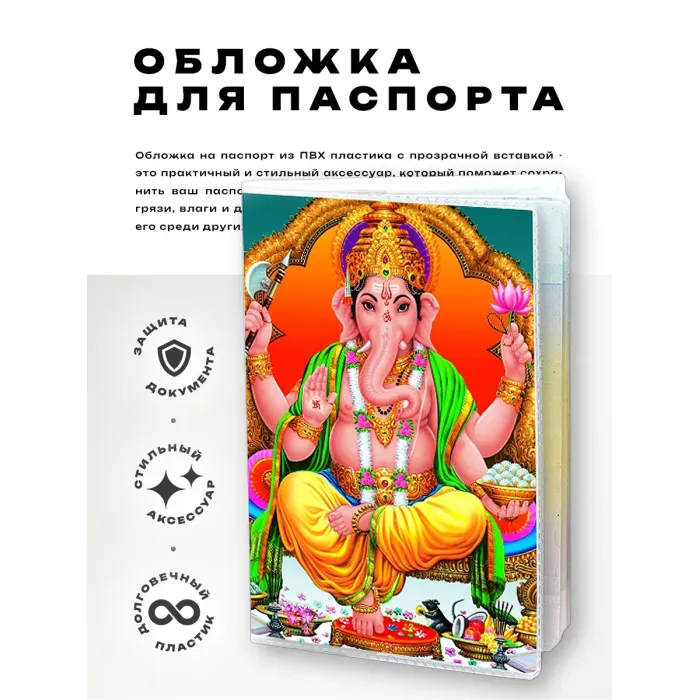 Обложка для паспорта Ганеша из прозрачного ПВХ-пластика — это стильный и практичный аксессуар, который не только защищает документ, но и придаёт ему уникальность. Изображение божества Ганеши символизирует удачу и благополучие, что делает эту обложку отличным подарком или сувениром.