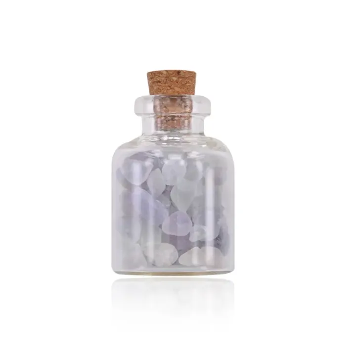 Сувенирный образец природного минерала флюорита в стеклянном флаконе с пробкой.