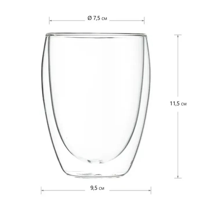 - Материал: жаропрочное стекло- Объём: 350 мл- Конструкция: двойные стенки- Совместимость: подходит для горячих и холодных напитков- Особенности ухода: допускается мытьё в посудомоечной машине и вручную
