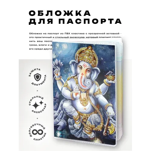 Обложка для паспорта Ганеша — это стильный и практичный аксессуар, который не только защищает документ, но и привносит элементы восточной культуры в повседневную жизнь. Изготовленная из прозрачного ПВХ-пластика, она позволяет легко увидеть паспорт при необходимости.
