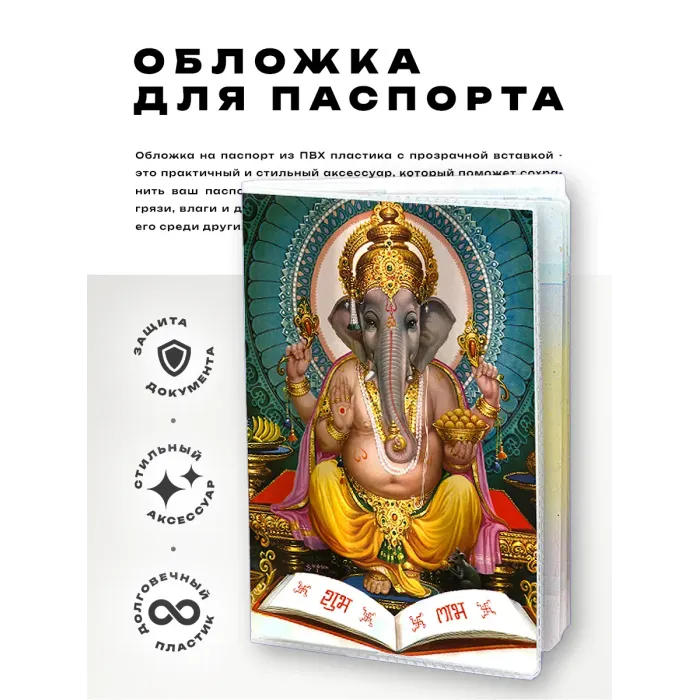 Обложка для паспорта Ганеша — это стильный и практичный аксессуар, который не только защищает документ, но и отражает богатую индийскую культуру. Изготовленная из прозрачного ПВХ-пластика, она обладает высокой прочностью и долговечностью.