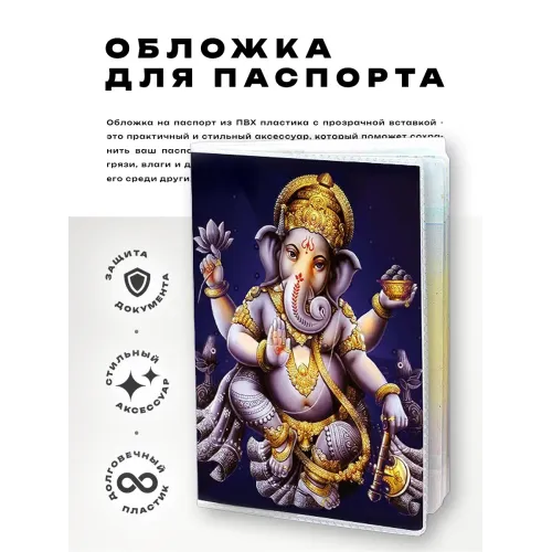 Обложка для паспорта Ганеша выполнена из прозрачного ПВХ-пластика и украшена яркой полиграфической вставкой с изображением божества. Этот аксессуар не только защищает паспорт от повреждений, но и придаёт ему уникальный стиль, отражая богатую индийскую культуру. Обе стороны обложки имеют одинаковое изображение, что делает её симметричной и эстетически привлекательной. Упаковка в полипропиленовый пакет с вырубкой под еврокрючок позволяет удобно хранить и демонстрировать товар.