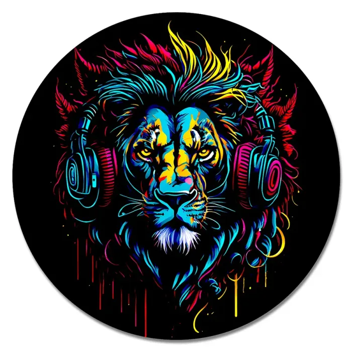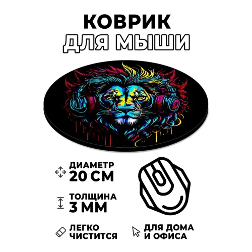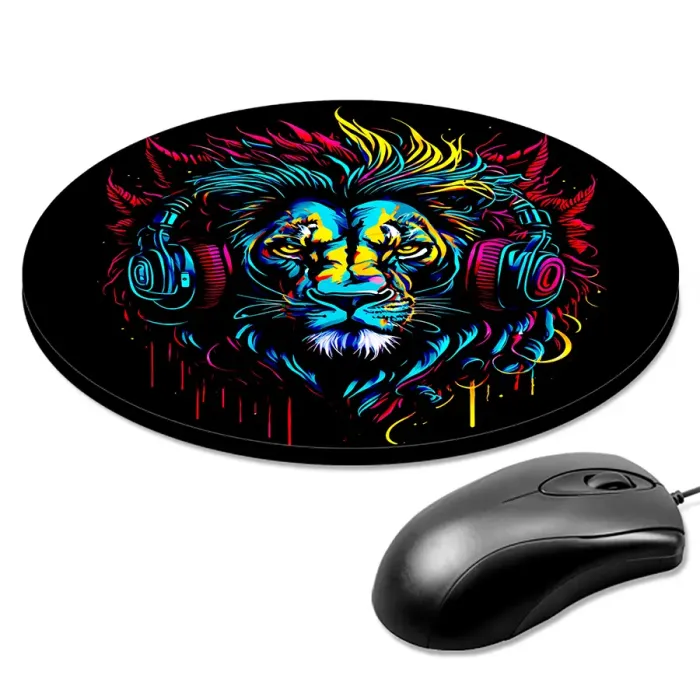 Коврик для компьютерной мыши круглой формы с изображением льва в наушниках.