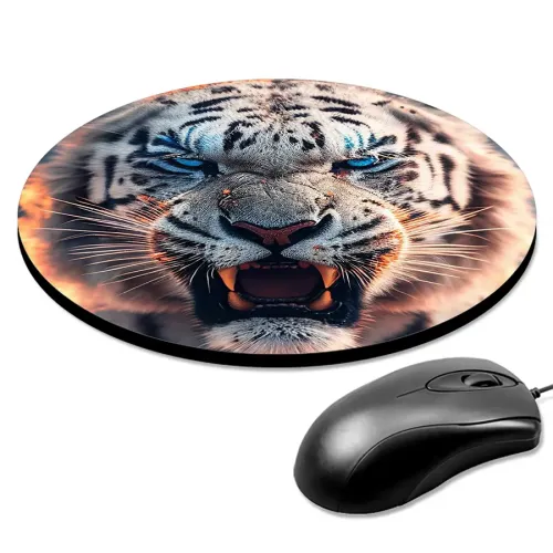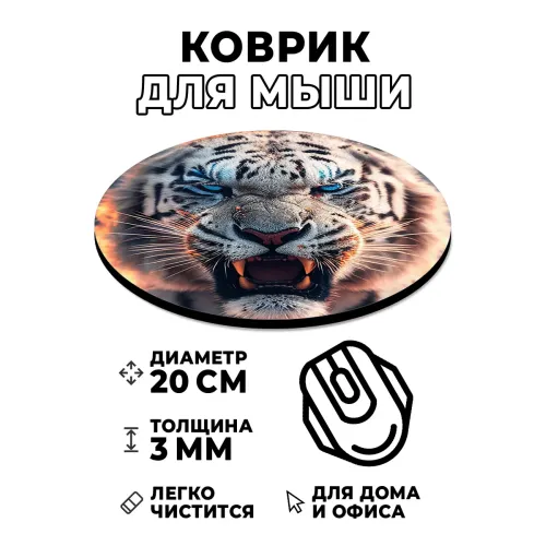 Коврик для компьютерной мыши с круглой формой и изображением белого тигра. Диаметр 20 см, толщина 3 мм.