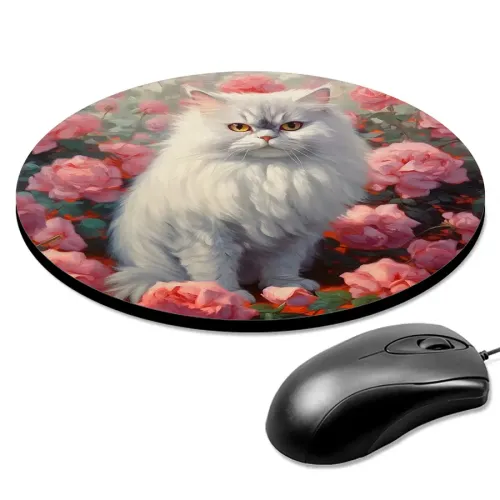 Коврик для компьютерной мыши с круглой формой и изображением кота и цветов.