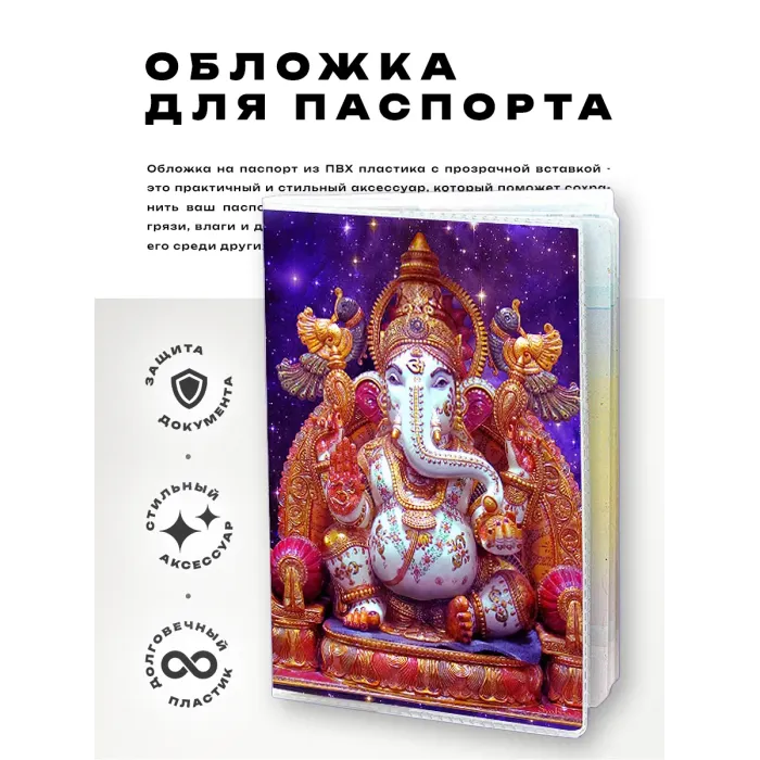 Обложка для паспорта Ганеша — это не только стильный аксессуар, но и символ удачи и благополучия. Изготовленная из прозрачного ПВХ-пластика, она защитит паспорт от повреждений и загрязнений. Основные особенности: