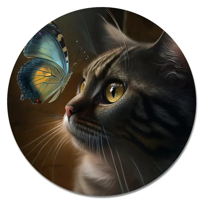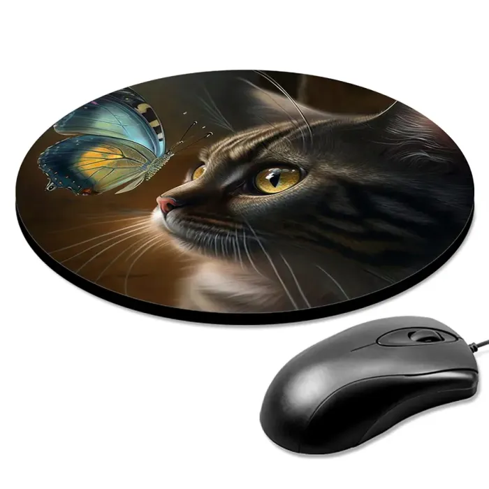Коврик для компьютерной мыши круглой формы с полноцветным изображением кота и бабочки.