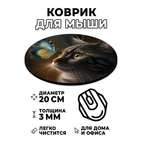 Коврик для мыши Кот и бабочка, d.20см KM1058