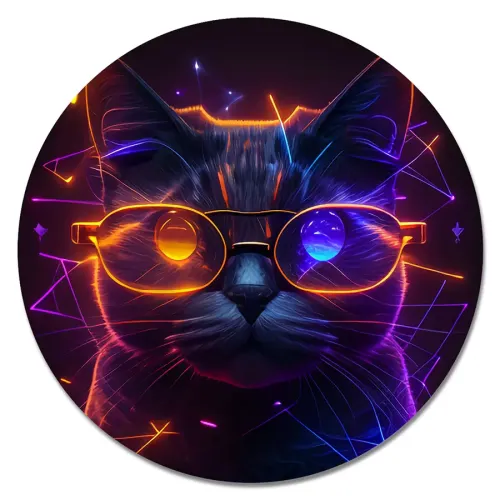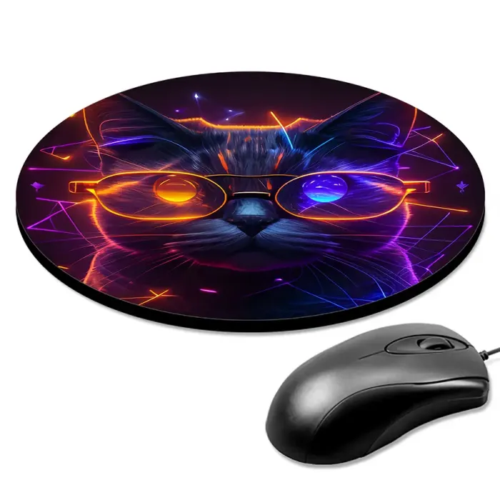 Коврик для компьютерной мыши круглой формы с изображением кибер кота в очках.