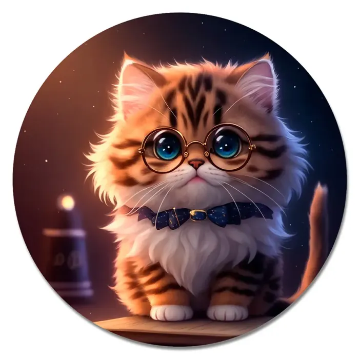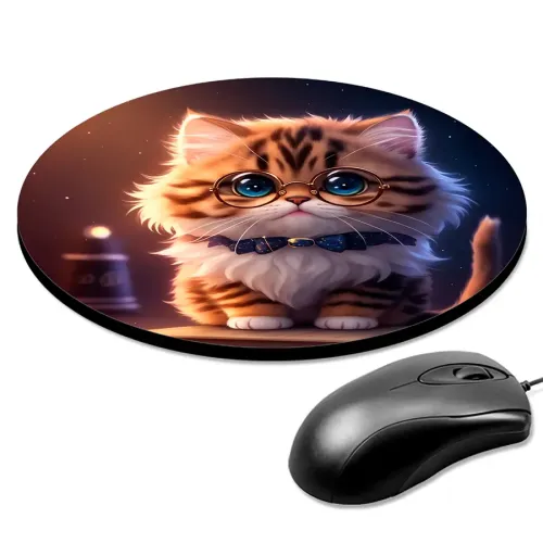 Коврик для компьютерной мыши круглой формы с изображением котёнка в очках.
