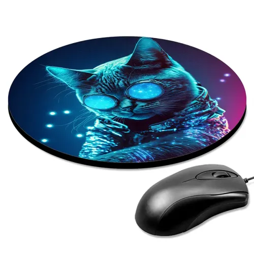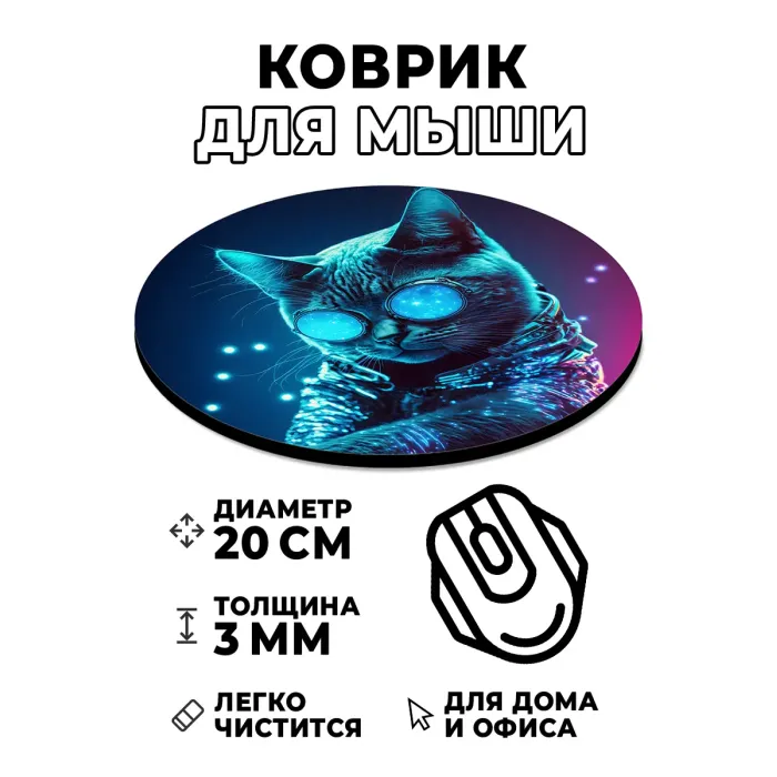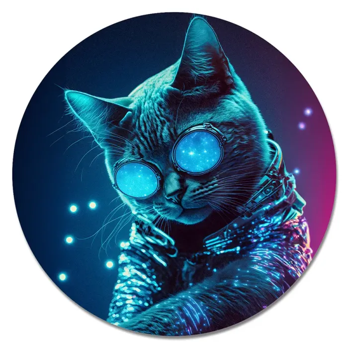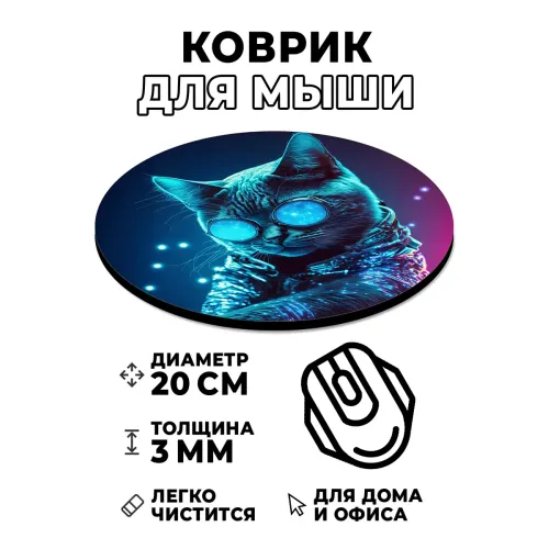 Коврик для компьютерной мыши круглой формы с изображением кота в очках.