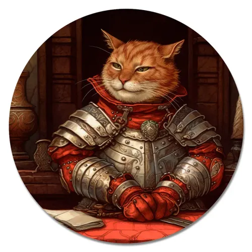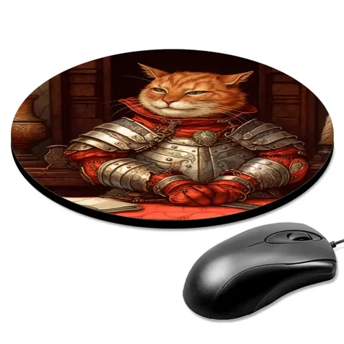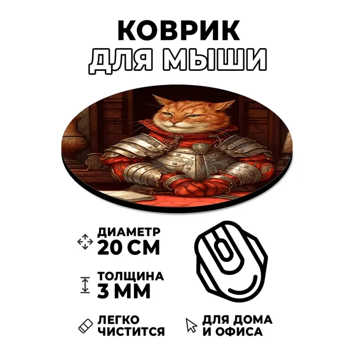 Коврик для компьютерной мыши круглой формы с изображением кота в доспехах.