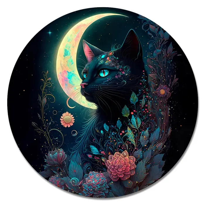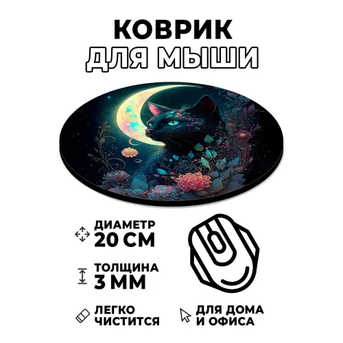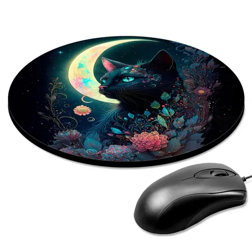 Коврик для компьютерной мыши круглой формы с изображением ночной кошки.
