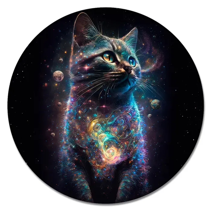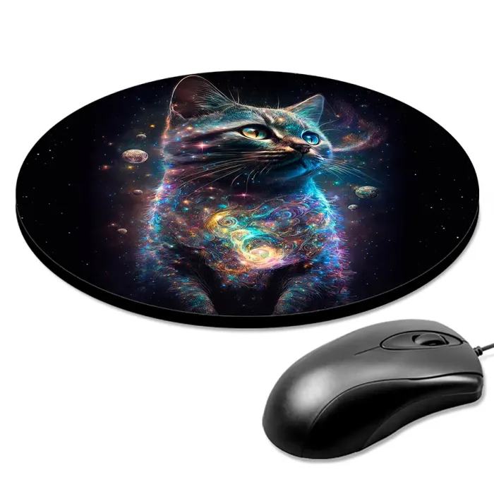 Коврик для компьютерной мыши круглой формы с изображением кота в космосе.