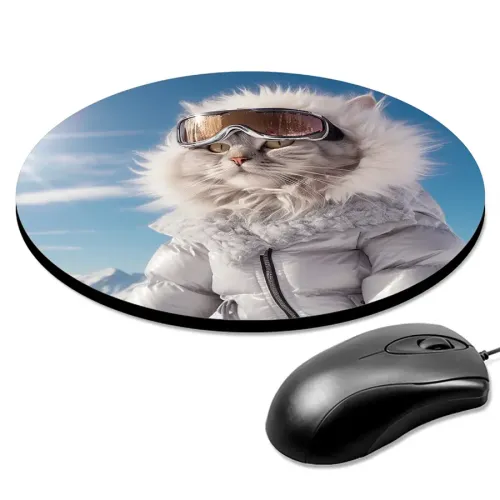 Коврик для компьютерной мыши круглой формы с изображением кота на зимнем курорте.