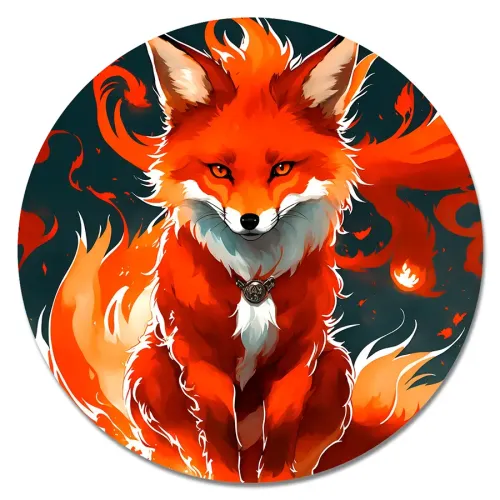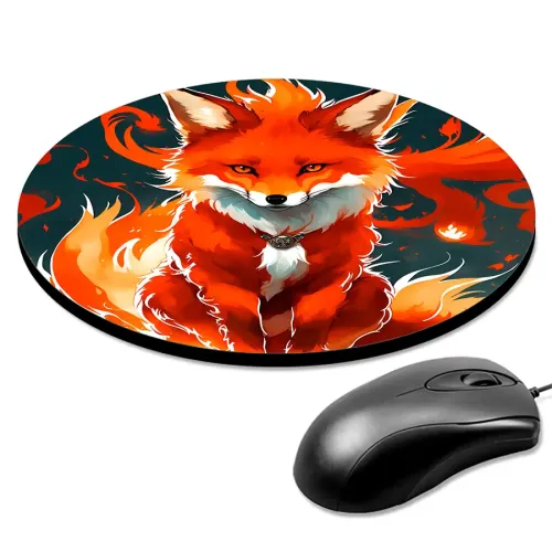 Коврик для компьютерной мыши круглой формы с полноцветным изображением огненной лисы.