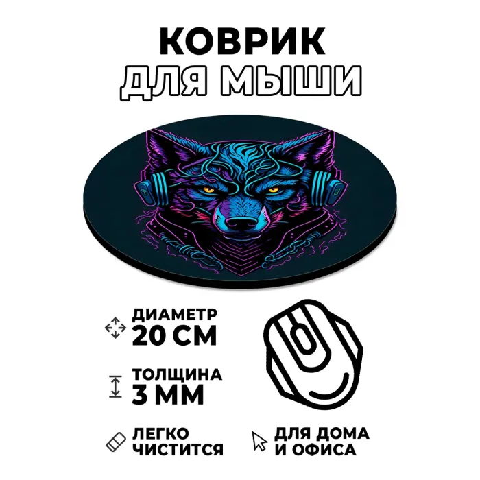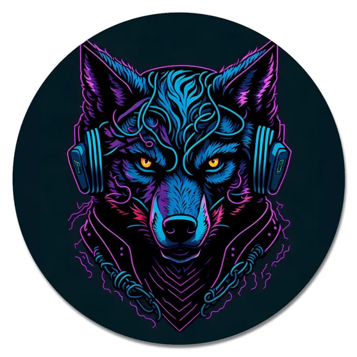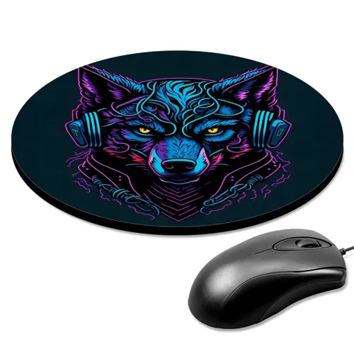 Коврик для компьютерной мыши круглой формы с изображением волка в наушниках.