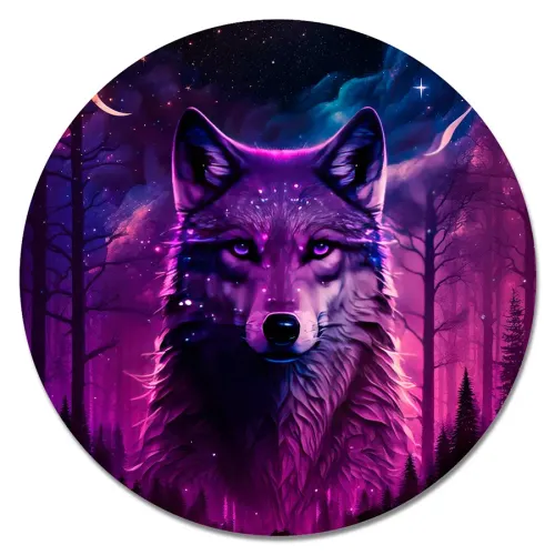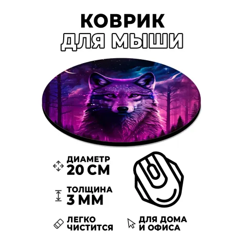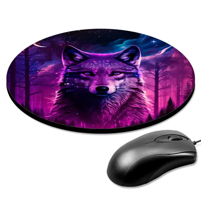 Коврик для компьютерной мыши круглой формы с изображением волка в лесу.