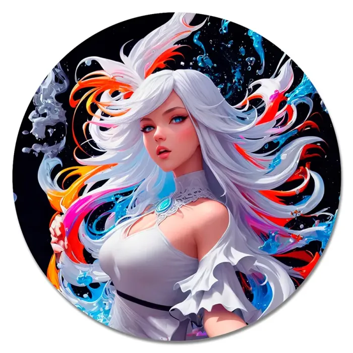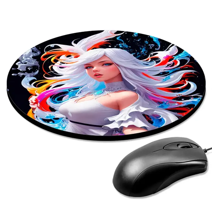 Коврик для компьютерной мыши круглой формы с полноцветным изображением девушки с белыми волосами.