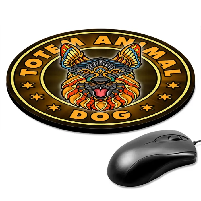 Коврик для компьютерной мыши с круглым дизайном и изображением собаки.