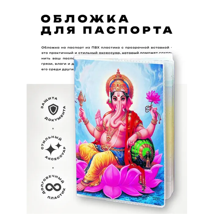 Обложка для паспорта Ганеша — это стильный и практичный аксессуар, который не только защитит документ от повреждений, но и станет символом удачи и благополучия. Изготовленная из прозрачного ПВХ-пластика, обложка имеет полиграфическую вставку с изображением Ганеши на обеих сторонах. Основные преимущества: