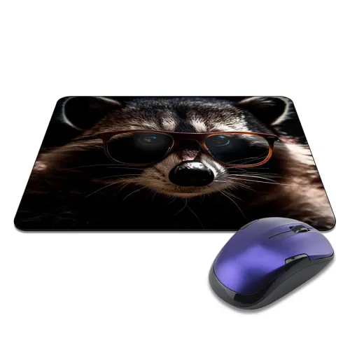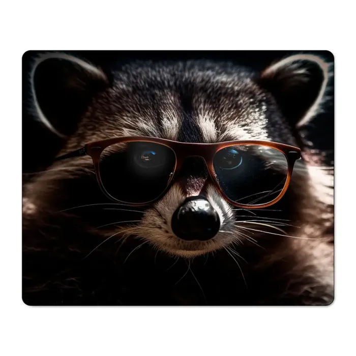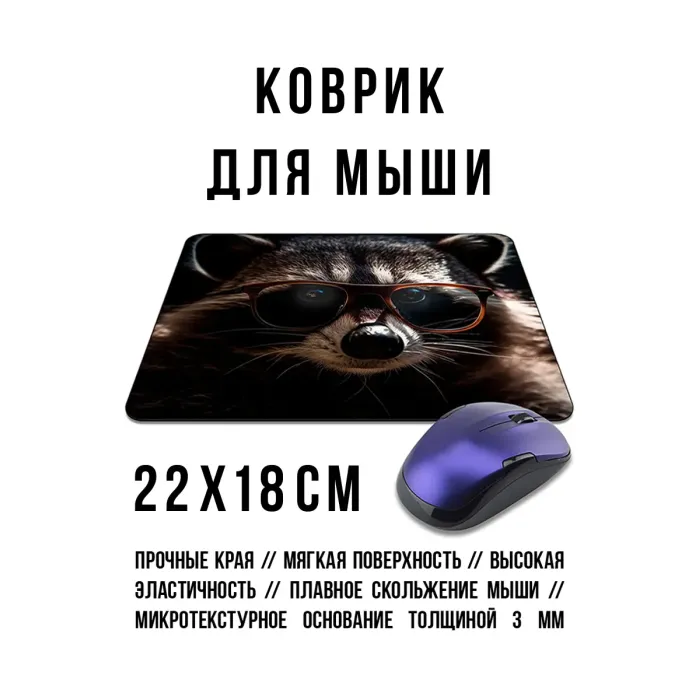 Коврик для мыши с изображением енота в очках. Изготовлен из прорезиненного материала.