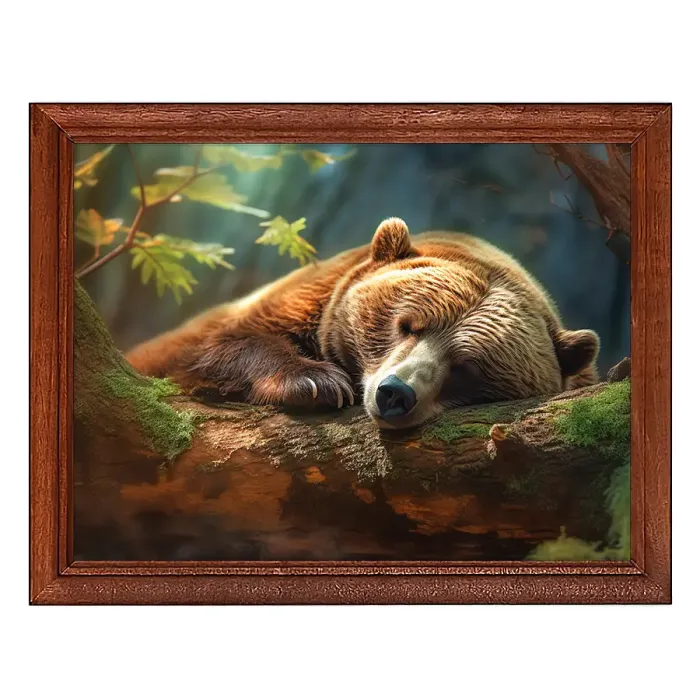 Постер в рамке для интерьерного декора. Изображение «Мишка в лесу» заключено в деревянную рамку с пластиковым стеклом.