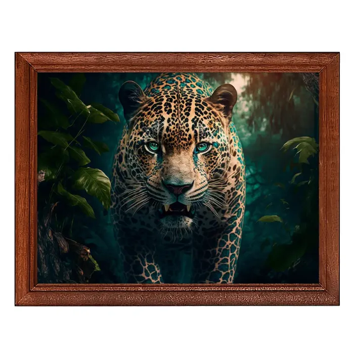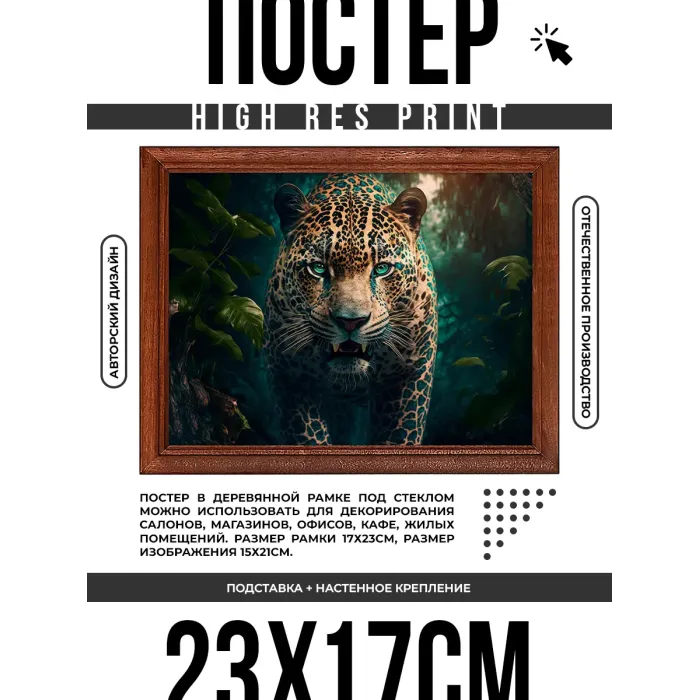 Постер в деревянной рамке с изображением леопарда для настольной установки или настенного крепления.