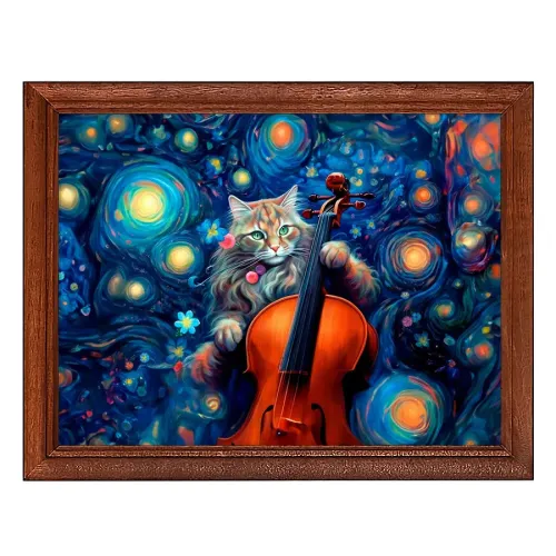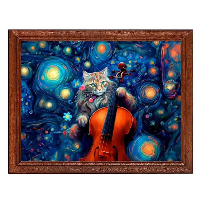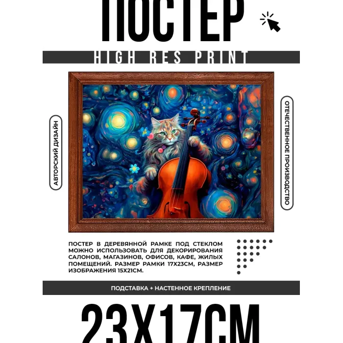 Постер в деревянной рамке с изображением кота, играющего на скрипке.