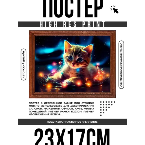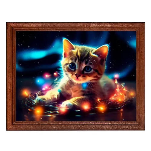 Постер в рамке с изображением котёнка с гирляндой. Рамка деревянная, изображение защищено пластиковым стеклом.