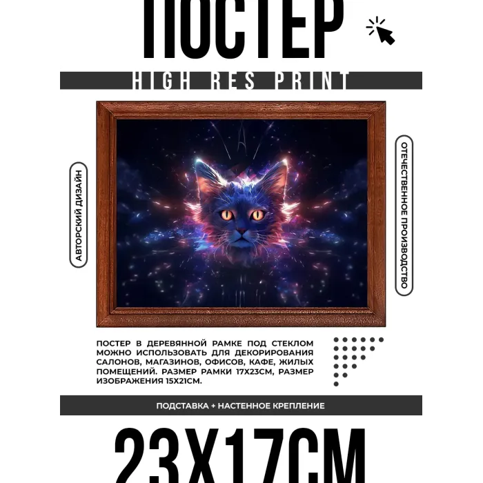 Постер в рамке с изображением астрального кота для настольной установки или настенного крепления.