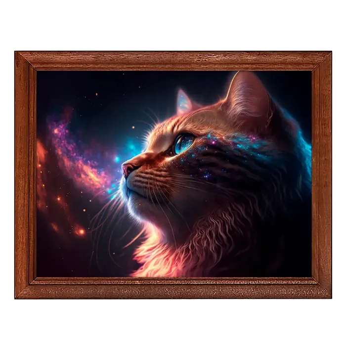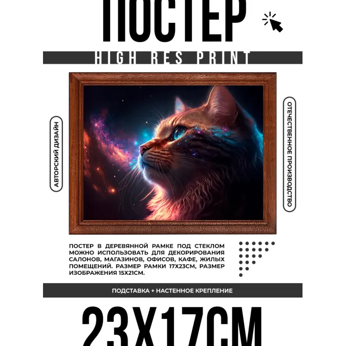 Постер в рамке для интерьерного декора. Деревянная рама с пластиковым стеклом, изображение кота на фоне галактики.
