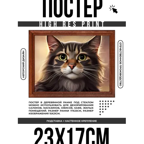Постер в рамке с изображением кошки для настенного или настольного размещения.