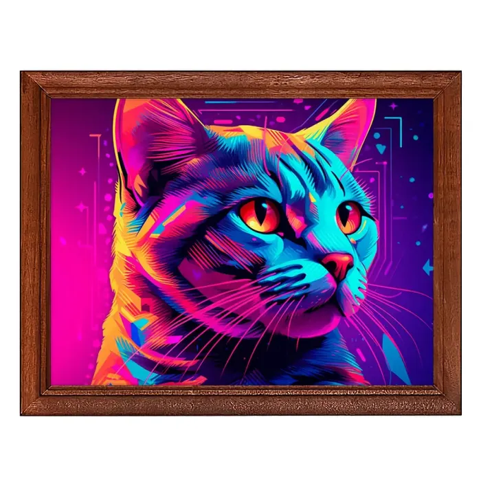 Постер в рамке для интерьерного декора. Деревянная рама с пластиковым стеклом и изображением неонового кота.