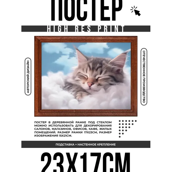 Постер с изображением спящего котёнка в деревянной рамке для настольной или настенной установки.
