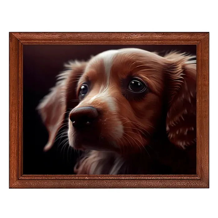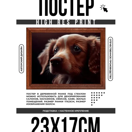 Постер в рамке с изображением щенка для интерьерного декора. Деревянная рама под пластиковым стеклом с ножкой и петлёй для размещения.