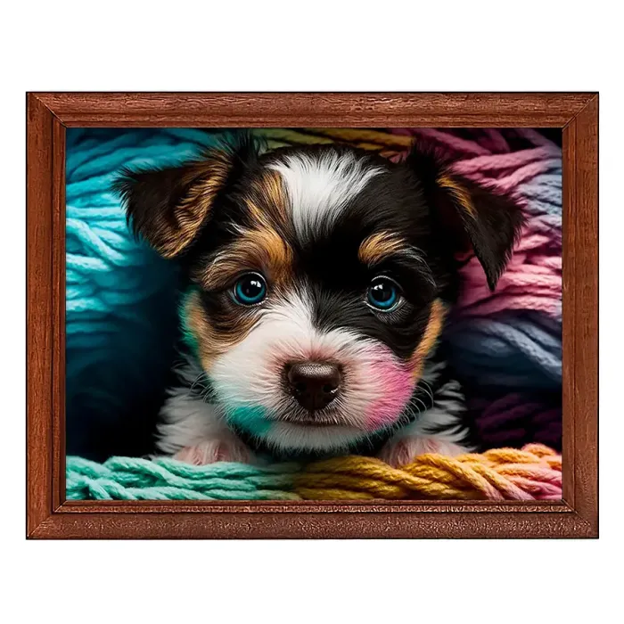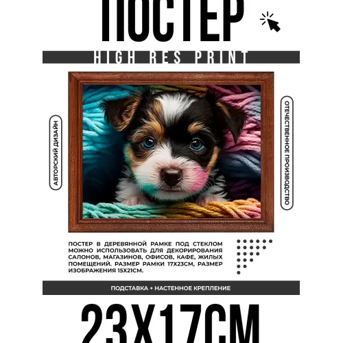 Постер в рамке для интерьерного декора. Деревянная рамка с пластиковым стеклом и изображением щенка.