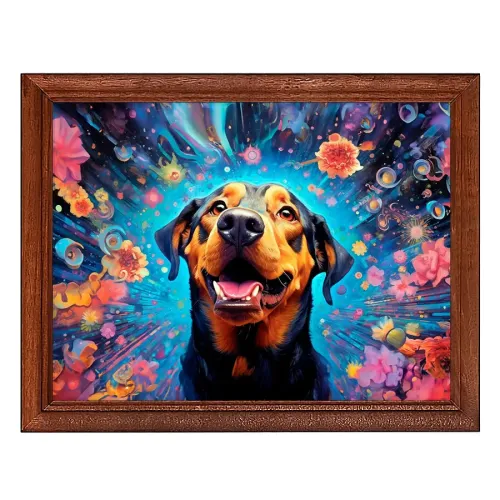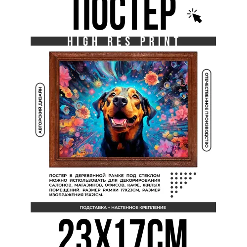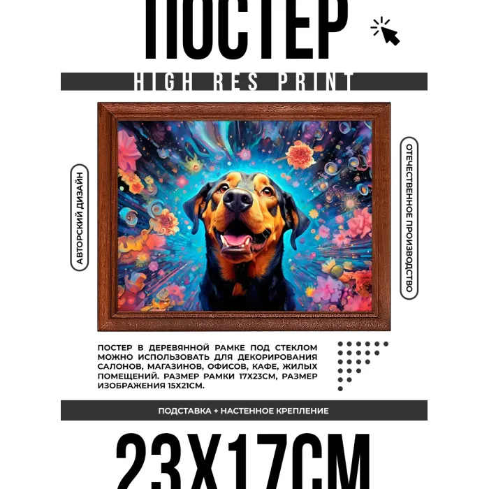 Постер в рамке с изображением пса и цветов для настенного или настольного размещения.