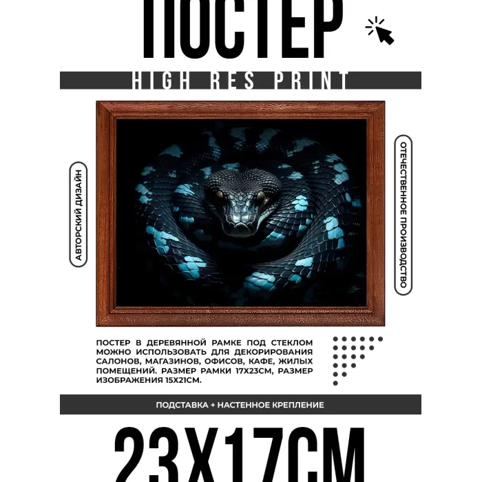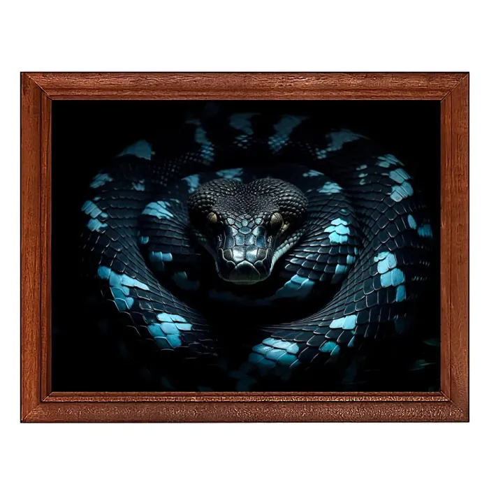 Постер в рамке для интерьерного декора. Деревянная рама с пластиковым стеклом, изображение змеи.