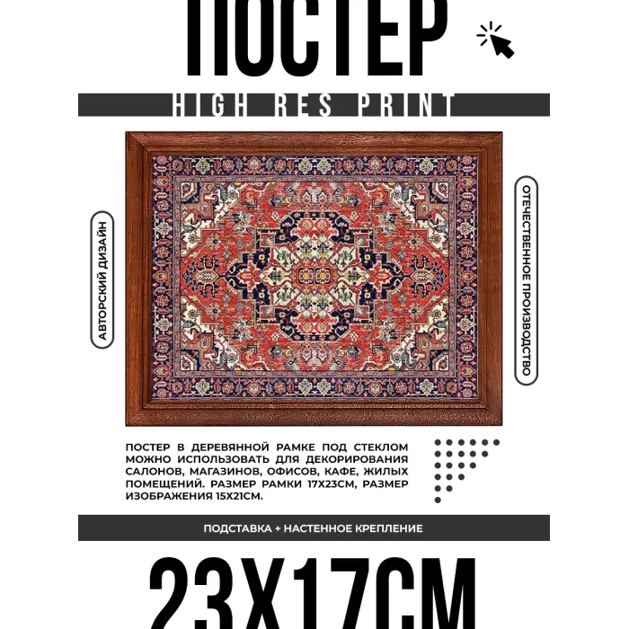 Постер в рамке с изображением персидского ковра для интерьерного декора. Деревянная рама под пластиковым стеклом.