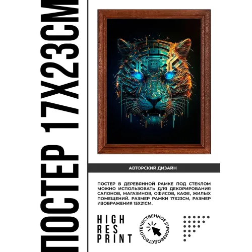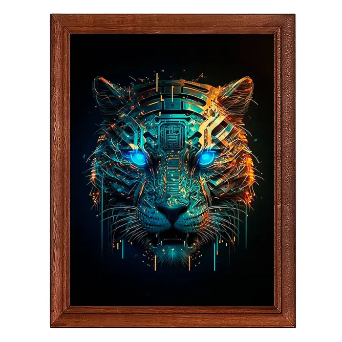 Постер в рамке для интерьерного декора с изображением кибер-тигра. Рамка деревянная, изображение защищено пластиковым стеклом.