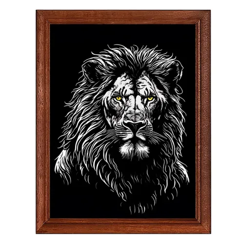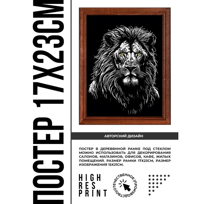 Постер в рамке с изображением льва для декорирования интерьера. Рама деревянная со вставкой из пластика.