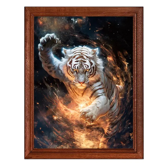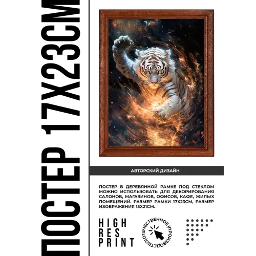 Постер с изображением белого тигра в деревянной рамке с пластиковым стеклом. Имеет петлю для настенного крепления и ножку для установки на поверхность.