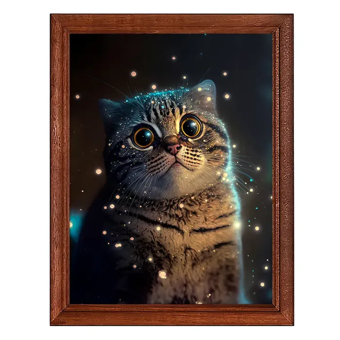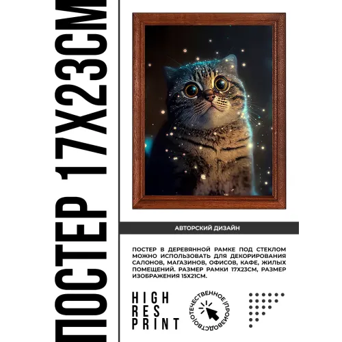 Постер в деревянной рамке с изображением удивлённого кота. Назначение — интерьерный декор.