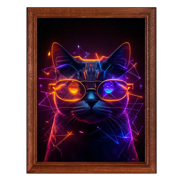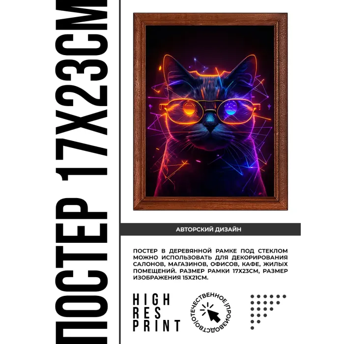 Постер в рамке для интерьерного декора. Изображение — «Кибер кот в очках». Рамка деревянная, под пластиковым стеклом.