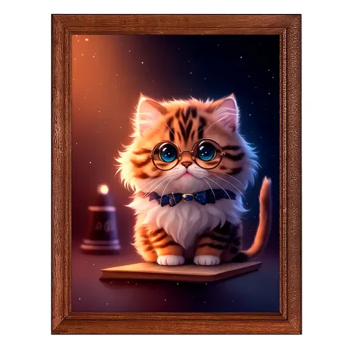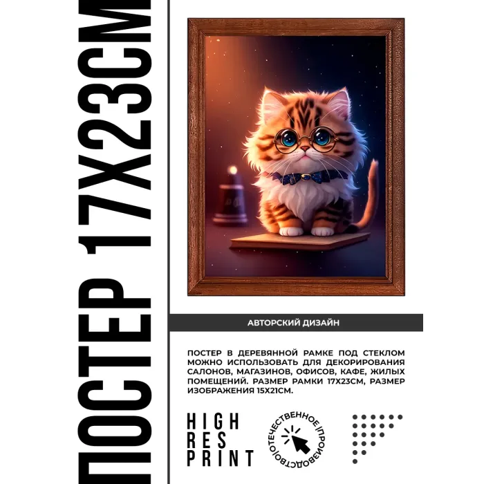 Постер в рамке для настольной установки или настенного крепления. Деревянная рамка с пластиковым стеклом, изображение котёнка в очках.