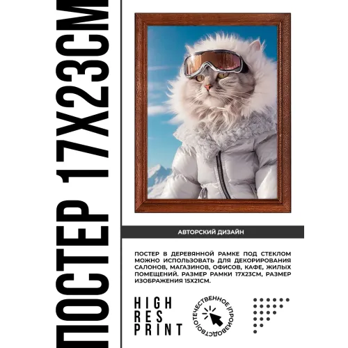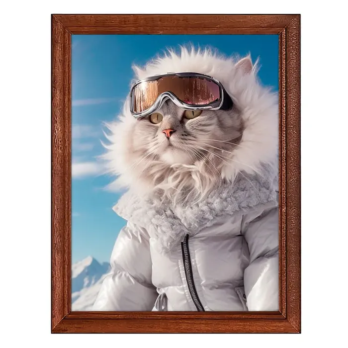 Постер в рамке с изображением кота на зимнем курорте. Деревянная рамка с пластиковым стеклом.