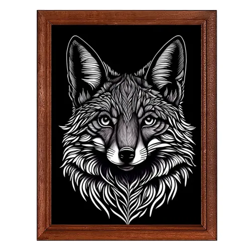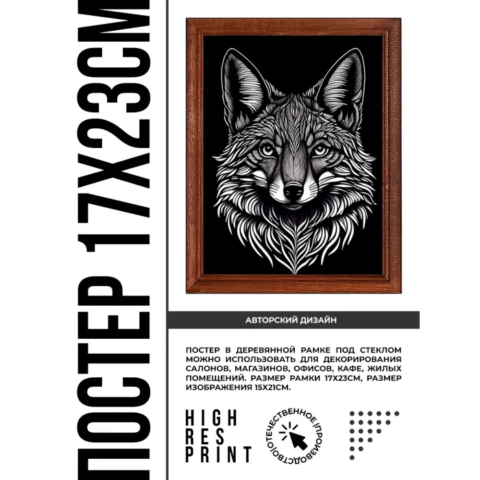 Постер в деревянной рамке с чёрно-белым изображением лисы для настольной установки или настенного крепления.