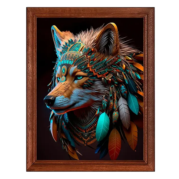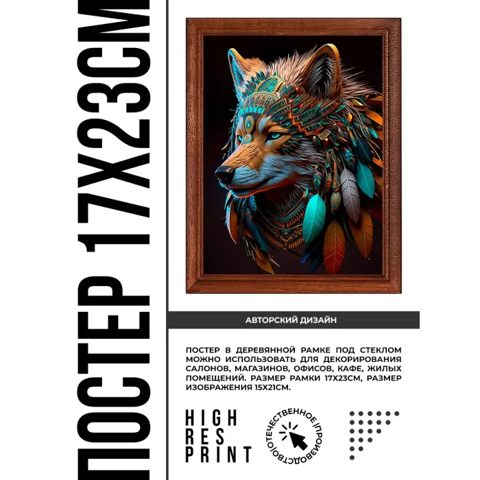 Постер в деревянной рамке с изображением волка индейца для настенного или настольного размещения.