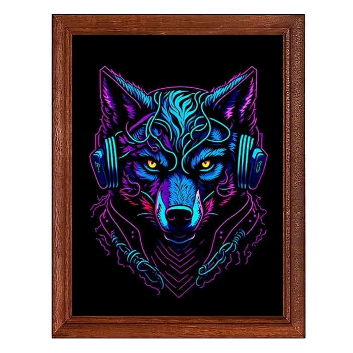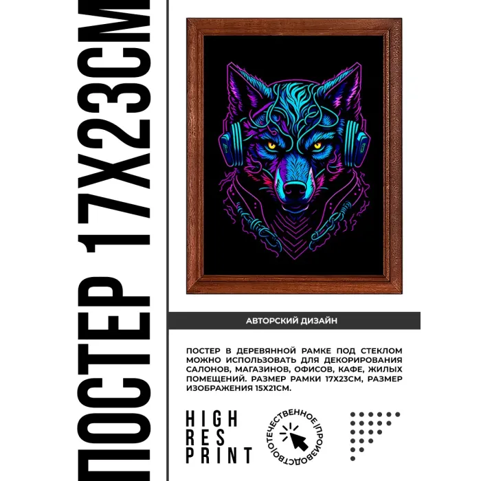 Постер в рамке с изображением волка в наушниках. Деревянная рамка с пластиковым стеклом.
